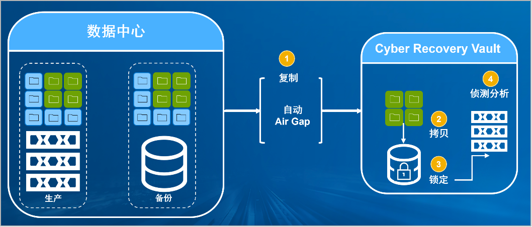 尊龙凯时z6com防勒索病毒方案将生产中心备份数据复制到Vault区,复制后网络自动断开实现弹性隔离。Vault区的数据快速拷贝,并对拷贝版本加锁(在锁定期数据不允许删除和修改)。Vault沙箱内对拷贝版本进行扫描分析,验证数据是否完好。